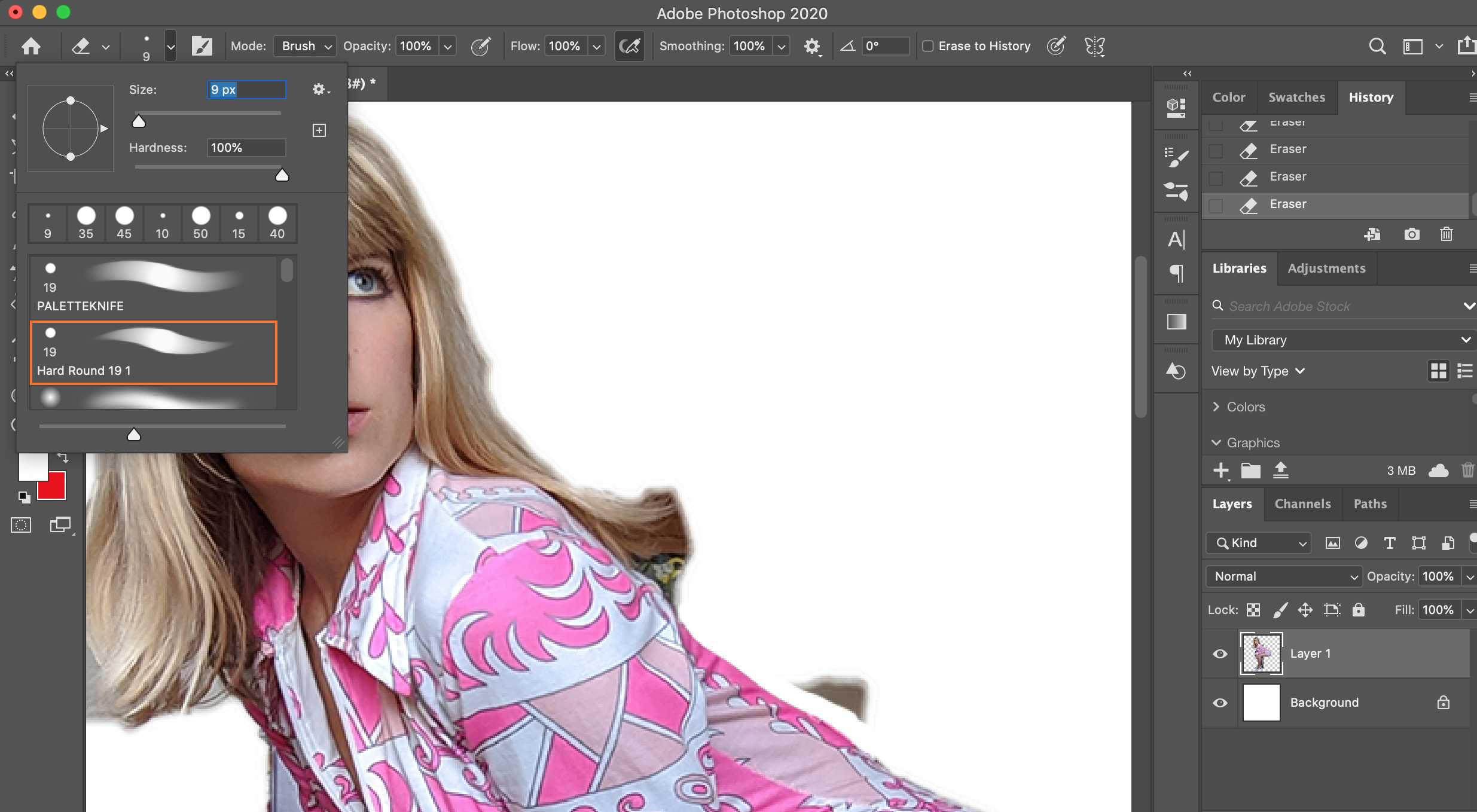 Got that? Now what you want to do is grab your eraser tool and set it to a dense/hard brush. This way, you’ll cleanly tidy up the image and not have any remnants left over that might look crappy later on.