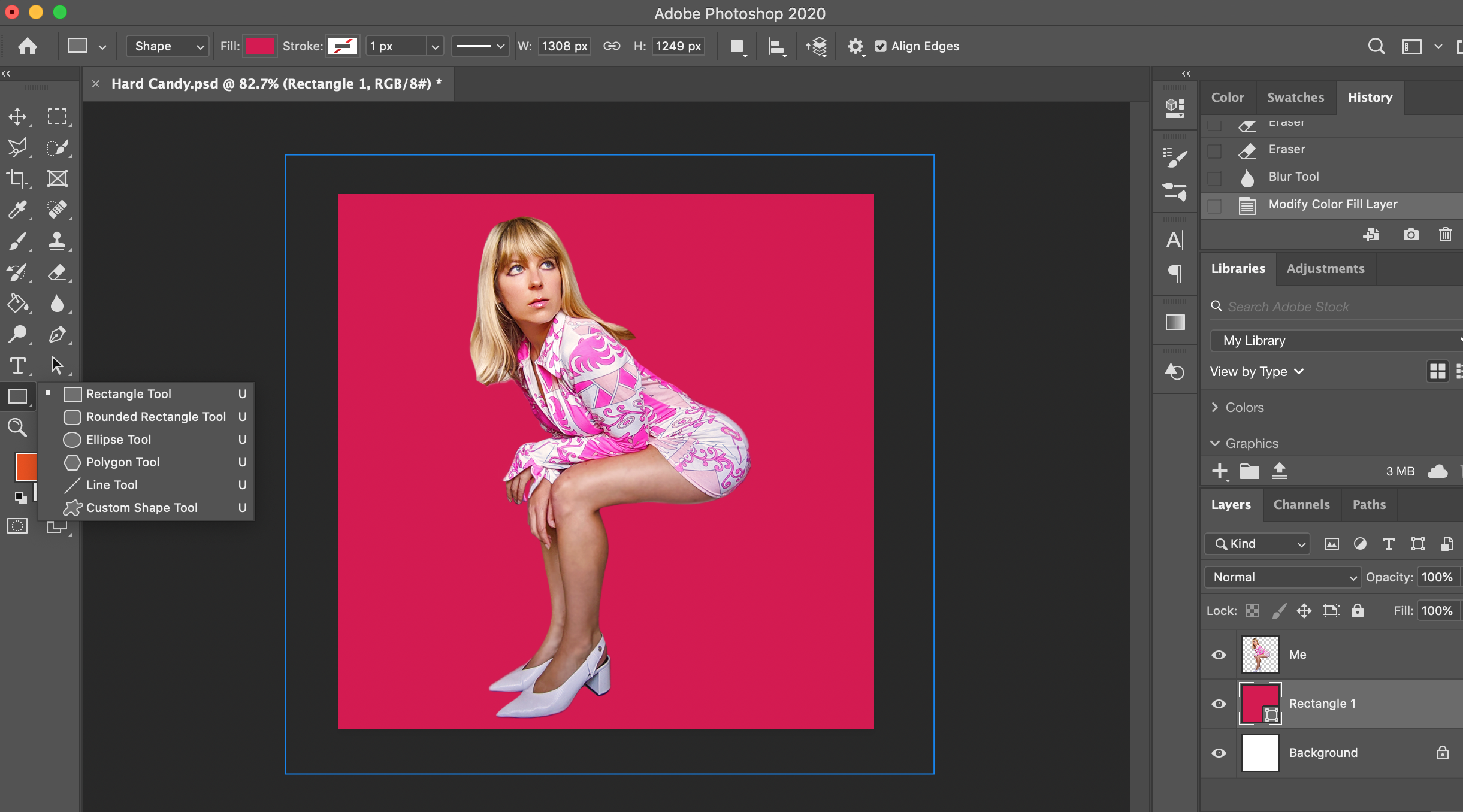 You’ve got to have a bright AF background colour to make this edit pop - so find one that speaks to you, grab your Rectangle Tool, and lay that colour down as your “Background” colour in a layer behind your image. Don’t forget, you can always go back and change this colour if it doesn’t work first time round (I almost always do,) but it’s a great starting point to guide you as you go.