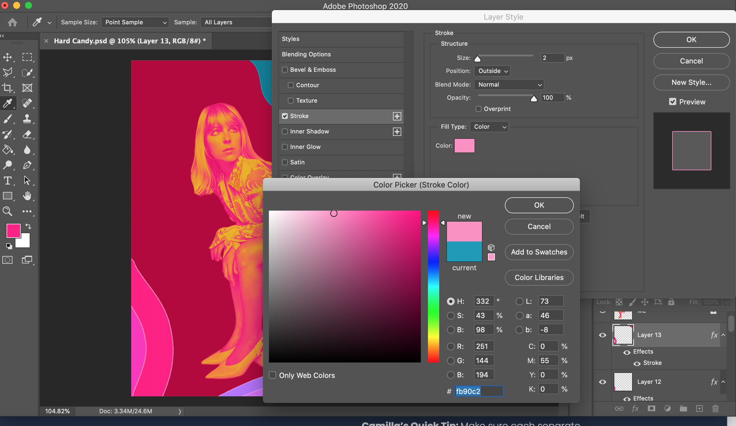 Once you’ve illustrated your heart out, I like to outline my illustrations (again, you don’t have to do so if it doesn’t suit what you’re doing) - or in Photoshop terms, a “Stroke,” and then choose a colour that suits this look. E.g. If you’ve got a dark pink shape, perhaps add a light pink stroke to bring out the colours a bit more. Don’t make the size of the stroke too big either - it needs to just be an outline!