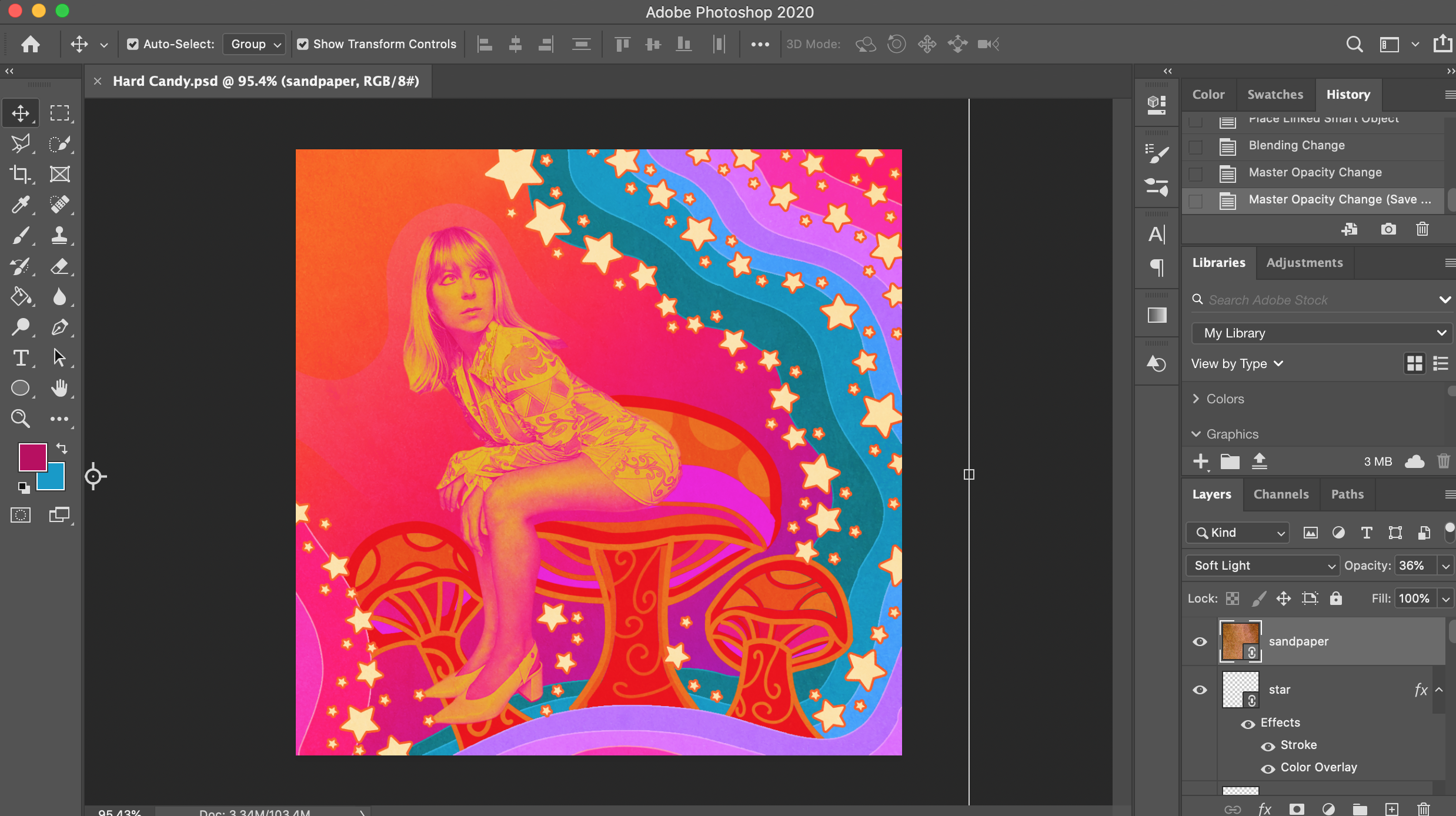 Once you’ve done that, select the sandpaper layer, then under the “Layers” tab on the far right where it says “Normal",” choose “Overlay” or “Soft Light,” and adjust the opacity to a level that you like. Play around with this until you achieve an effect that looks good to you.