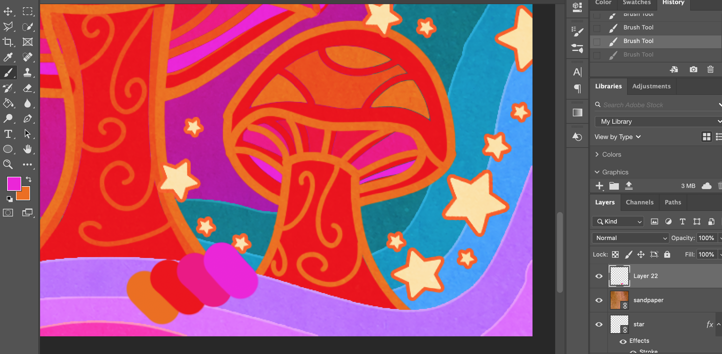 Not only that, I’ve created some more illustrative elements such as the mushrooms and winding lines of colours on the right side of the piece. I’ve done these by just blocking in the colours I want, bucket filling in the spaces where I want additional colours, and adding little swirl details on top as I see fit.